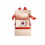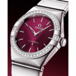 Ce modèle en acier inoxydable de 28 mm arbore une lunette éclatante pavée de diamants. Le cadran soleillé bordeaux est rehaussé d’une finition laquée teintée, ainsi que d’aiguilles et d’une étoile en or blanc 18K polies et squelettées à 6 heures et d’index en or blanc 18K poli.