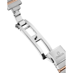 Calibre OMEGA 4061 : Mouvement à quartz avec fonction « Long Life » pour optimiser l’autonomie de la pile. Logo Omega rouge exclusif avec composants rhodiés et perlage.