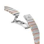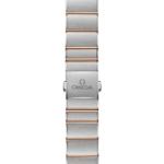 Calibre OMEGA 4061 : Mouvement à quartz avec fonction « Long Life » pour optimiser l’autonomie de la pile. Logo Omega rouge exclusif avec composants rhodiés et perlage.