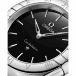 Calibre OMEGA 4061 : Mouvement à quartz avec fonction « Long Life » pour optimiser l’autonomie de la pile. Logo Omega rouge exclusif avec composants rhodiés et perlage.
