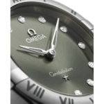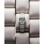 Ce modèle de 28 mm arbore un boîtier et un bracelet en acier inoxydable, ainsi qu’un superbe cadran vert matcha comportant des index et des éléments appliqués en or blanc 18K.