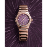 Ce modèle de 29 mm en or Sedna™ 18K arbore une lunette éclatante pavée de diamants. Le cadran en PVD violet est orné d’un motif Supernova unique réalisé par gravure électrochimique, ainsi que d’un guichet de date à 6 heures, d’aiguilles et d’une étoile en or Sedna™ 18K, et d’index en diamants avec chatons en or Sedna™ 18K.
