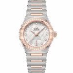 Cette montre de 29 mm est dotée d'un boîtier et d'un bracelet mono-rang en acier inoxydable et or Sedna™ 18K. Elle arbore les caractéristiques signature de la Constellation, dont les griffes polies, les facettes en demi-lune et une lunette pavée de diamants.