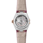 La montre est présentée sur un étincelant bracelet en cuir bordeaux et animée par le calibre OMEGA Co-Axial Master Chronometer 8700, visible à travers le fond de boîte en verre saphir.