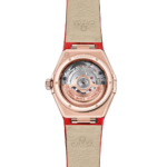 Ce modèle de 29 mm se distingue par son cadran, fabriqué en pierre aventurine rouge naturelle ainsi que par son bracelet en cuir dont les reflets chatoyants y sont assortis.