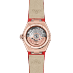Ce modèle de 29 mm se distingue par son cadran, fabriqué en pierre aventurine rouge naturelle ainsi que par son bracelet en cuir dont les reflets chatoyants y sont assortis.