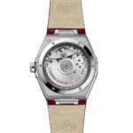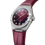 Ce modèle en acier inoxydable de 36 mm arbore une lunette polie sertie de 38 diamants, un cadran bordeaux traité PVD avec finition soleillée et un guichet de date à 6 heures. Les aiguilles, le logo OMEGA, l’étoile Constellation et les index sont en or blanc 18K.