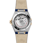 Ce modèle en acier inoxydable et or jaune 18K de 36 mm arbore une lunette polie sertie de 38 diamants, un cadran bleu traité PVD avec finition soleillée et un guichet de date à 6 heures. Les aiguilles, le logo OMEGA, l’étoile Constellation et les index sont en or jaune 18K.
