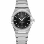 Ce modèle en acier inoxydable de 39 mm arbore une lunette gravée de chiffres romains, un cadran soleillé noir et un guichet de date à 6 heures. Les aiguilles, le logo OMEGA, l’étoile Constellation et les index sont tous façonnés en or blanc 18K.