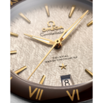 Ce modèle de 41 mm en acier inoxydable et or jaune 18K est doté d’une lunette en céramique brune polie avec des chiffres romains revêtus de Ceragold™ OMEGA. Il comporte un cadran gris rhodium rehaussé d’une finition estampillée d’un motif rappelant la soie et d’un guichet de date à 6 heures. Les aiguilles, le logo OMEGA, l’étoile Constellation et les index sont également façonnés en or jaune 18K.