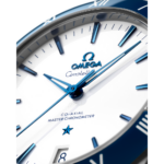 Ce modèle de 41 mm en acier inoxydable arbore une lunette en céramique bleue polie ornée de chiffres romains en émail blanc Grand Feu, un cadran en céramique blanche et un guichet de date à 6 heures. Les aiguilles, le logo OMEGA, l’étoile Constellation et les index facettés sont bleuis.