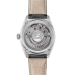 Sur le fond, on peut admirer un médaillon en acier inoxydable représentant l'Observatoire central. Le cadran « pie-pan » argenté opalin rappelle quant à lui la première montre Constellation de 1952.