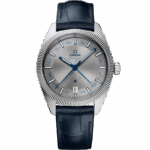Le cadran « Pie Pan » soleillé gris rappelle le premier modèle Constellation de 1952. Chacune de ses facettes est associée à un mois de l'année, une façon unique de représenter la fonction calendrier annuel. Il est orné d'une étoile Constellation et du logo OMEGA bleuis, ainsi que d'aiguilles et d'index facettés également bleuis, revêtus de Super-LumiNova.