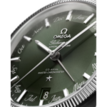 Enfin, cette montre dotée d'un bracelet en cuir vert est entraînée par le calibre OMEGA Co-Axial Master Chronometer Calendrier Annuel 8922, doté d'une technologie antimagnétique révolutionnaire.