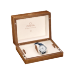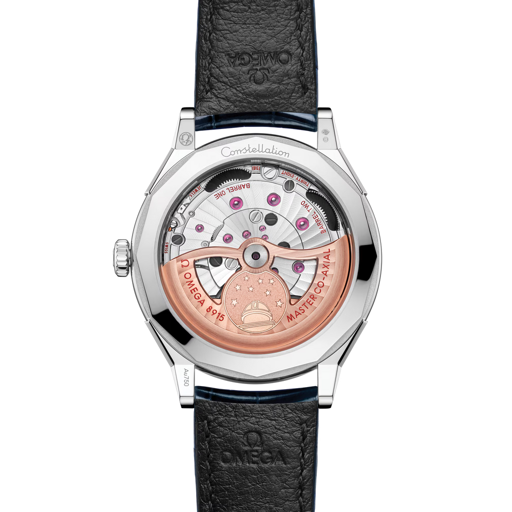 Entraînée par le calibre OMEGA 8915, c’est la première montre à deux aiguilles au monde à obtenir la certification Master Chronometer validée par METAS. Ce mouvement est visible à travers le fond de boîte en verre saphir, qui révèle un rotor squeletté en or Sedna™ 18K rehaussé d’un médaillon appliqué, décoré de l’observatoire signature des créations Constellation gravé au laser en finition contrastante. La montre est présentée dans un écrin spécial en marqueterie arborant le même emblème.