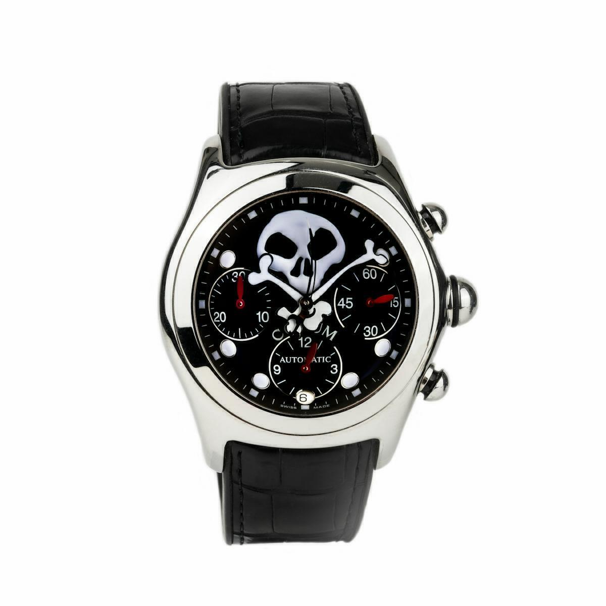 Occasion, Corum Bubble Jolly Roger, chronographe mouvement automatique, boitier acier 44mm, cadran noir, date, tête de mort "Joly Roger", bracelet cuir, boucle déployante acier