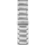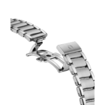 Pour ce modèle, de l'acier inoxydable a été utilisé pour le boîtier de 34 mm comme pour le bracelet. Les aiguilles polies en forme d'alpha sont faites en or blanc, tout comme les 11 index, sertis de diamants.