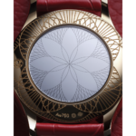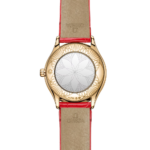 Elle arbore un boîtier de 26 mm en or Moonshine™ 18K, serti de diamants suivant délicatement les courbures de chaque côté. Un diamant unique orne la couronne, entouré d’une fleur en céramique hybride rouge. Le cadran bombé est réalisé en émail Grand Feu blanc crème et présente des aiguilles rhodiées polies au diamant et les chiffres romains rouges en décalque.
