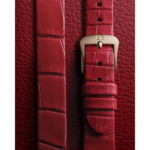 Elle repose sur un bracelet double tour en cuir d’alligator laqué rouge fermé par une boucle Trésor. Elle est entraînée par le calibre OMEGA 4061, dissimulé par un fond de boîtier miroir exclusif orné du motif « Her Time » métallisé.