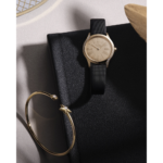 Elle repose sur un bracelet en satin noir fermé par une boucle Trésor. Elle est entraînée par le calibre OMEGA 4061, dissimulé par un fond de boîtier miroir exclusif orné du motif « Her Time » métallisé.