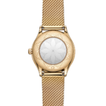 La montre est dotée d’un bracelet milanais en or Moonshine™ 18K estampillé d'un motif rappelant la soie avec une boucle déployante particulière. Elle est entraînée par le Calibre OMEGA 4061, dissimulé par un fond de boîtier métallisé en verre saphir effet miroir orné du motif « Her Time ».