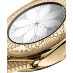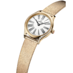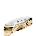 Elle arbore un boîtier de 26 mm en or Moonshine™ 18K, serti de diamants suivant délicatement les courbures de chaque côté. Un diamant unique orne la couronne, entouré d’une fleur en céramique liquide rouge. Le cadran bombé est réalisé en émail Grand Feu blanc crème et présente des aiguilles noircies et les chiffres romains en décalque.