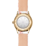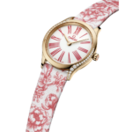 Elle arbore un boîtier de 26 mm en or Moonshine™ 18K, serti de diamants suivant délicatement les courbures de chaque côté. Un diamant unique orne la couronne, entouré d’une fleur en céramique liquide rouge. Le cadran bombé est réalisé en émail Grand Feu blanc crème et présente des aiguilles polies au diamant en or Moonshine™ 18K et les chiffres romains roses en décalque.