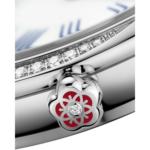 Elle arbore un boîtier de 26 mm en acier inoxydable, serti de diamants suivant délicatement les courbures de chaque côté. Un diamant unique orne la couronne, entouré d’une fleur en céramique liquide rouge. Le cadran bombé est réalisé en émail Grand Feu blanc crème et présente des aiguilles rhodiées polies au diamant et les chiffres romains bleus en décalque.