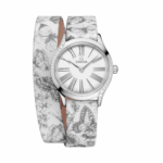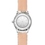 Elle arbore un boîtier de 26 mm en acier inoxydable, serti de diamants suivant délicatement les courbures de chaque côté. Un diamant unique orne la couronne, entouré d’une fleur en céramique liquide rouge. Le cadran bombé est réalisé en émail Grand Feu blanc crème et présente des aiguilles rhodiées polies au diamant et les chiffres romains gris en décalque.
