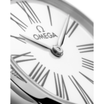 Calibre OMEGA 4061 : Mouvement à quartz avec fonction « Long Life » pour optimiser l’autonomie de la pile. Logo Omega rouge exclusif avec composants rhodiés et perlage.