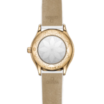 Elle repose sur un bracelet en cuir d’alligator blanc laqué fermé par une boucle Trésor. Elle est entraînée par le calibre OMEGA 4061, dissimulé par un fond de boîte miroir exclusif orné du motif métallisé « Her Time ».