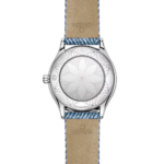Cette montre est présentée sur un bracelet double tour en cuir de veau bleu à motif jean avec une boucle Trésor. Elle est entraînée par le calibre OMEGA 4061, dissimulé par un fond de boîte miroir exclusif orné du motif métallisé « Her Time ».