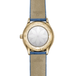 Elle repose sur un bracelet double tour en cuir d’alligator bleu laqué fermé par une boucle Trésor. Elle est entraînée par le calibre OMEGA 4061, dissimulé par un fond de boîte miroir exclusif orné du motif métallisé « Her Time ».