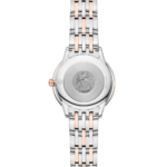 Sur ce modèle de 30 mm en acier inoxydable et en or Sedna™ 18K, le cadran PVD rose-gris foncé présente une finition cristal. L’affichage se distingue par des aiguilles PVD de couleur or Sedna™, ainsi que par l’alternance de chiffres romains et d’index cabochon.