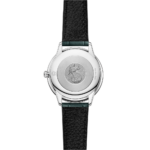 Sur ce modèle de 30 mm en acier inoxydable, le cadran PVD vert sapin présente un motif vertical aléatoire estampé dans une finition soleillée. L’affichage se distingue par des aiguilles rhodiées, ainsi que par l’alternance de chiffres romains et d’index diamantés.