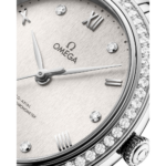Ce modèle de 34 mm en acier inoxydable arbore une lunette pavée de diamants et un cadran argenté au motif vertical aléatoire estampé dans une finition soleillée. L’affichage se distingue par des aiguilles rhodiées, ainsi que par l’alternance de chiffres romains et d’index diamantés.