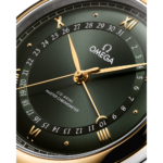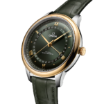 Présentée sur un bracelet en cuir vert, cette montre De Ville Prestige est animée par le calibre Co-Axial Master Chronometer 8936, que l'on peut voir à travers le fond en verre saphir.