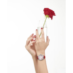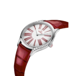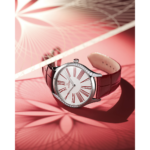 Calibre OMEGA 4061 : Mouvement à quartz avec fonction « Long Life » pour optimiser l’autonomie de la pile. Logo Omega rouge exclusif avec composants rhodiés et perlage.