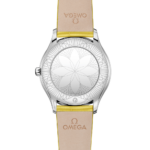 La montre, entraînée par le calibre OMEGA 4061, est montée sur un étincelant bracelet en cuir jaune avec une boucle en acier inoxydable. Son fond de boîtier miroir est orné d'un motif « Her Time » métallisé.
