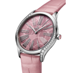 La montre, entraînée par le calibre OMEGA 4061, est montée sur un étincelant bracelet en cuir rose avec une boucle en acier inoxydable. Son fond de boîtier miroir est orné d'un motif « Her Time » métallisé.