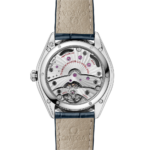 Ce modèle présente un boîtier poli en acier inoxydable de 40 mm monté sur un bracelet en cuir bleu. Le cadran bombé bleu comprend un guichet pour la petite seconde à 6 heures ainsi que des aiguilles et des index bombés en or blanc 18K.