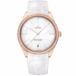 Ce modèle arbore un cadran bombé en nacre blanche doté d'aiguilles en or 18K poli et d'un guichet de date à 6 heures. Avec sa lunette sertie de diamants, le boîtier de 40 mm en or Sedna™ 18K est monté sur un bracelet en cuir blanc fermé par une boucle polie. Cette De Ville Trésor est animée par le calibre antimagnétique OMEGA Master Co-Axial 8511, un mouvement à remontage manuel unique.