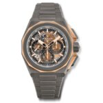 La montre DEFY Extreme dotée d’un chronographe affichant les 1/100e de seconde est réalisée en titane à la fois léger et robuste à la finition entièrement mate et rehaussée d’éléments en or rose. Le cadran en saphir teinté révèle le mouvement automatique de chronographe El Primero 21 à deux échappements. La montre DEFY Extreme est livrée avec un bracelet en titane ainsi qu'un bracelet en caoutchouc et un bracelet en Velcro.