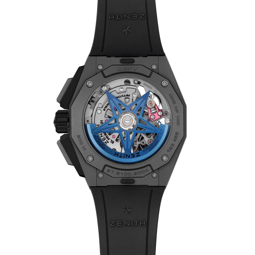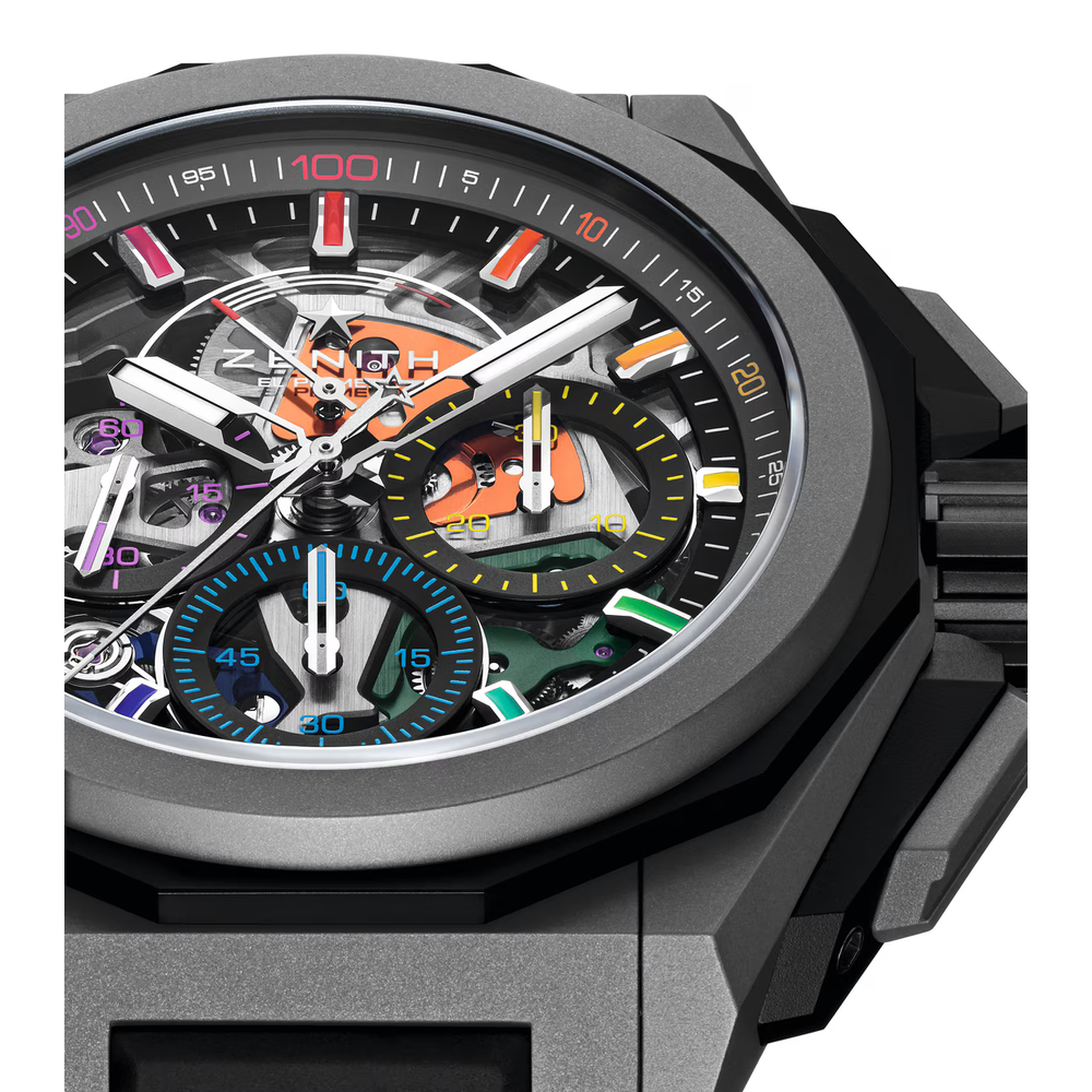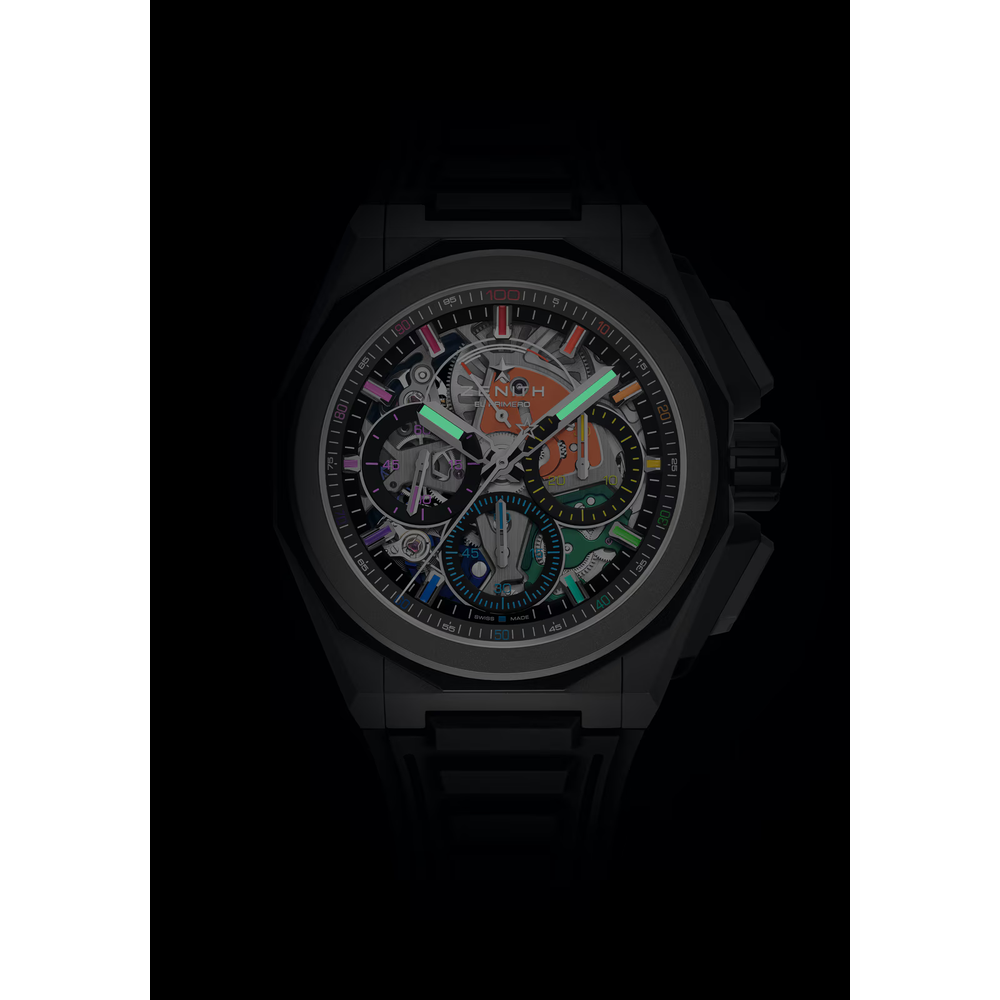 Limitée à seulement 100 exemplaires, la DEFY Extreme Chroma montre une façon d’explorer la couleur sans restriction. Ce chronographe en titane microbillé affichant les 1/100e de seconde est animé par le mouvement automatique El Primero 9004 à double architecture. Un premier échappement oscille à 5 Hz (36 000 alt/h) pour garantir un chronométrage précis, tandis que le second fonctionne à la fréquence étonnante de 50 Hz (360 000 alt/h) pour entraîner le chronographe.