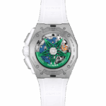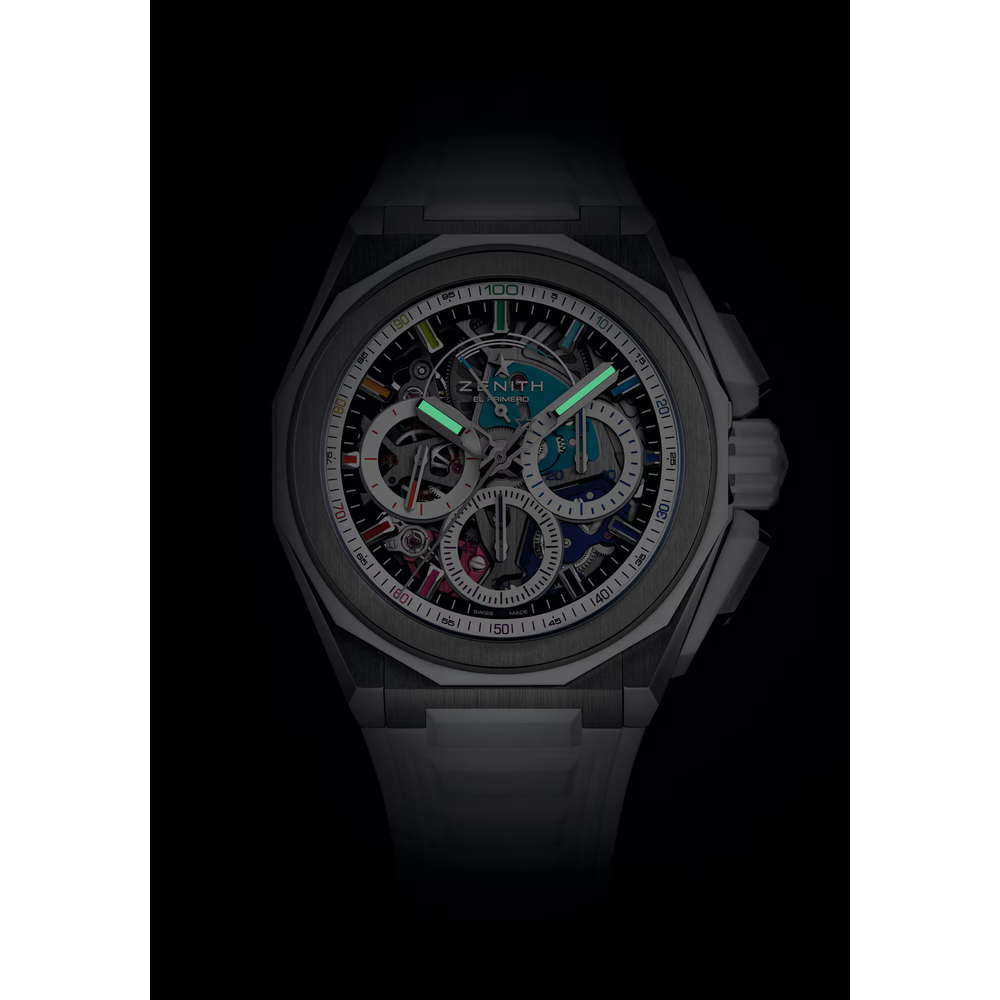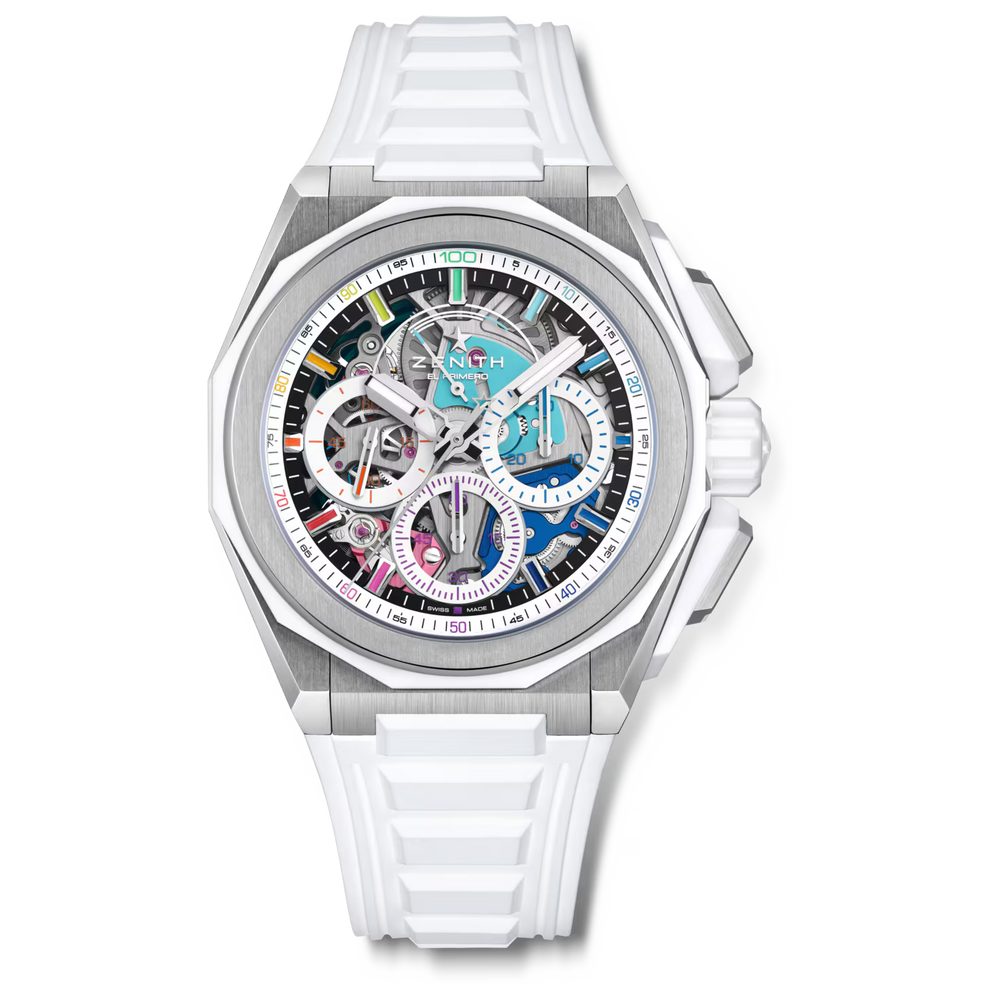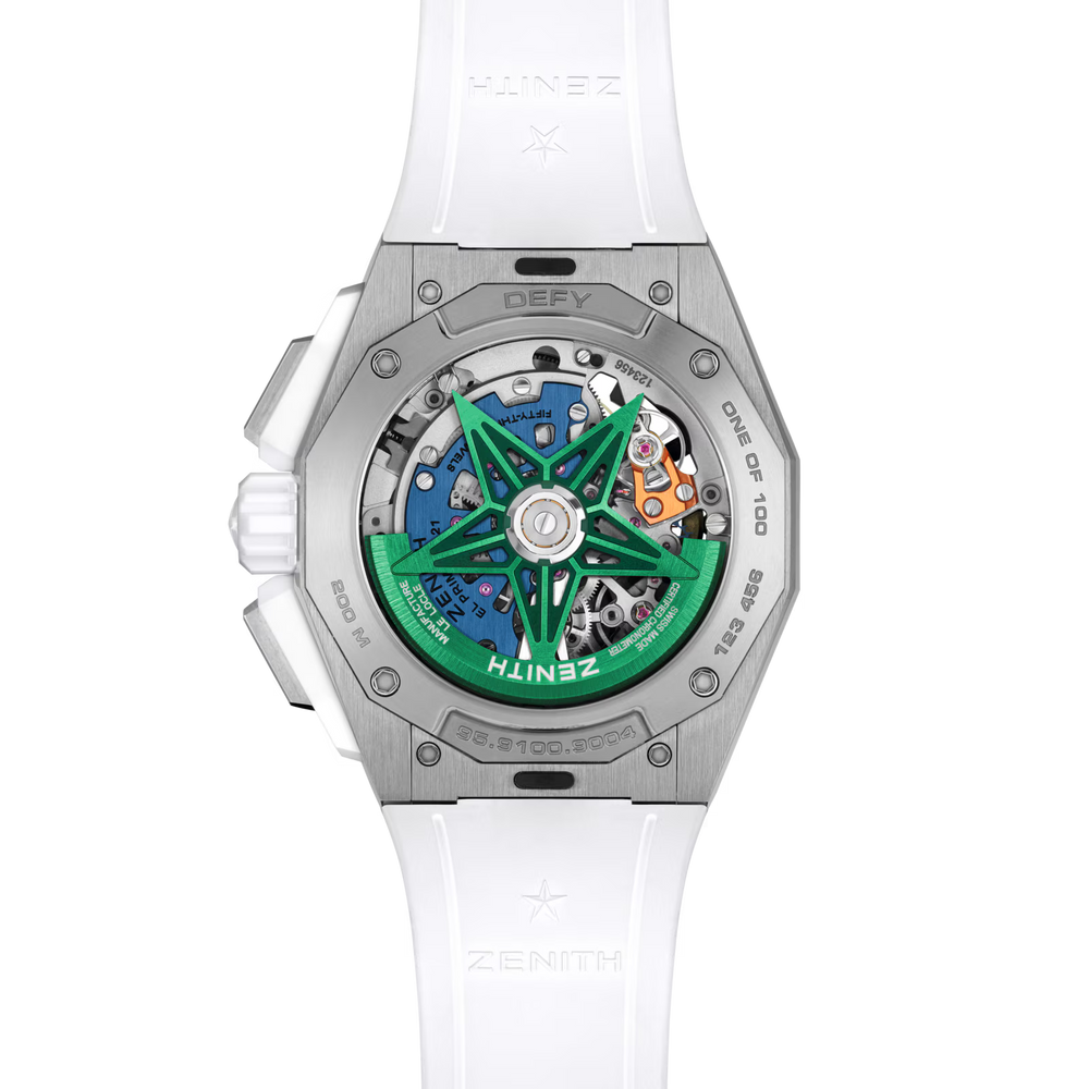 Conçue en titane et en céramique blanche, la DEFY Extreme Chroma est une édition limitée à 100 pièces sublimée par un spectre de couleurs unique. Son mouvement automatique El Primero 9004 présente une double architecture avec un premier régulateur oscillant à 5 Hz pour assurer un chronométrage précis, le deuxième oscillant à la fréquence étonnante de 50 Hz (360 000 alt/h) pour entraîner un chronographe affichant les 1/100e de seconde.