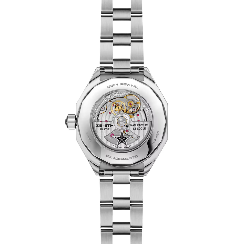 Une reproduction fidèle de l’une des toutes premières montres-bracelets DEFY de 1969. Ce modèle est doté d’un boîtier en acier inoxydable octogonal de 37 mm avec une lunette à 14 côtés, abritant un cadran argenté soleillé. Il est animé par le mouvement automatique de manufacture ELITE 670 et présenté sur l’emblématique bracelet échelle en acier.