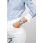Montre DEFY Skyline dotée d’un boîtier octogonal en acier de 41 mm rehaussé d’une lunette à facettes, avec un cadran bleu polaire à motif soleillé revisitant l’emblématique étoile à quatre branches de ZENITH. Animée par le mouvement de manufacture automatique à haute fréquence El Primero 3620 avec le tout premier indicateur au 1/10e de seconde. Livrée avec un bracelet en acier; un deuxième bracelet en caoutchouc à motifs bleu polaire est inclus pour profiter pleinement de l’interchangeabilité.