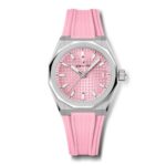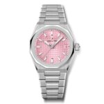 Montre DEFY Skyline dotée d’un boîtier octogonal en acier de 36 mm rehaussé d’une lunette à facettes, avec un cadran rose pastel métallisé à motif soleillé revisitant l'emblématique étoile à quatre branches de ZENITH. Animée par le mouvement automatique de Manufacture Elite 670. Livrée avec un bracelet en acier; un deuxième bracelet en caoutchouc à motifs roses est inclus pour profiter pleinement de l’interchangeabilité.