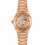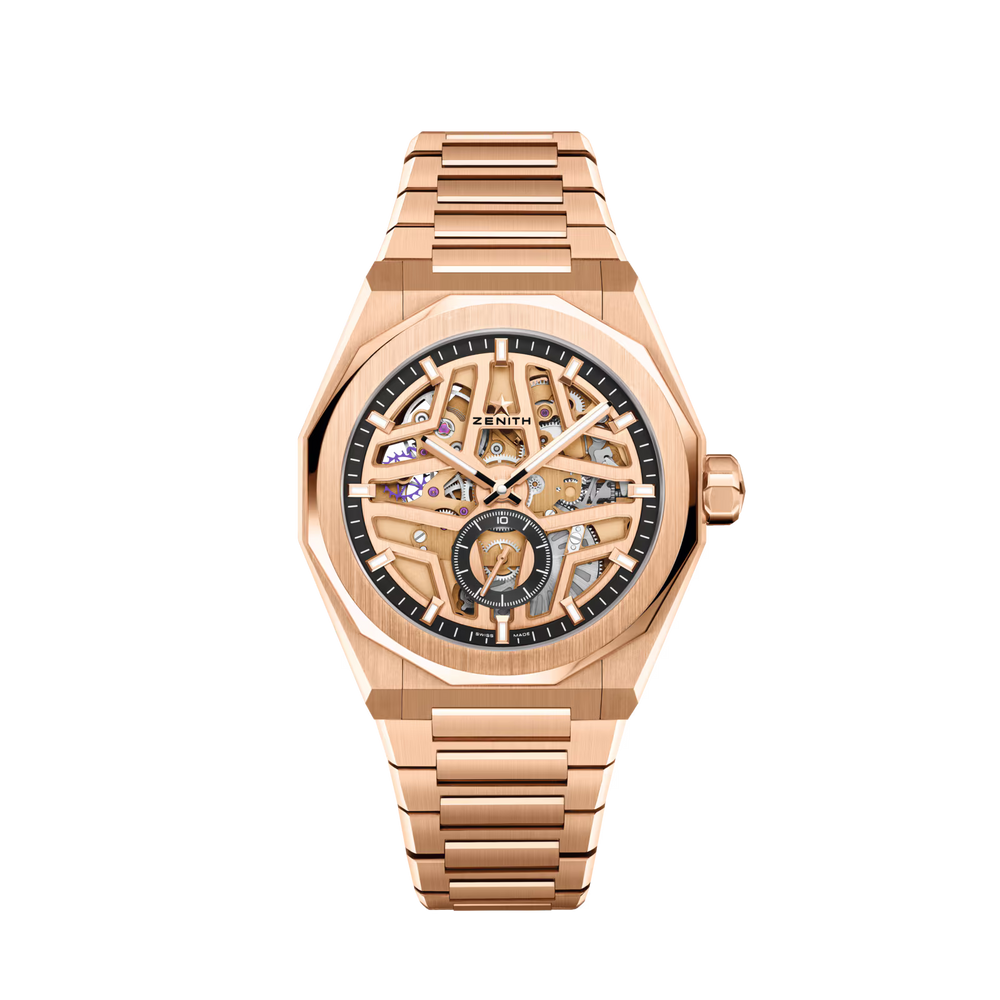 Montre DEFY Skyline dotée d’un boîtier octogonal de 41 mm en or rose rehaussé d’une lunette à facettes. Décliné dans une version dorée et ajourée, son mouvement El Primero 3620SK haute fréquence à remontage automatique présente un compteur des 1/10e de seconde innovant à 6 heures. Proposée avec un bracelet en or rose et un bracelet en caoutchouc noir à motifs avec une boucle déployante en or, facilement interchangeables grâce à notre système pratique de changement rapide.