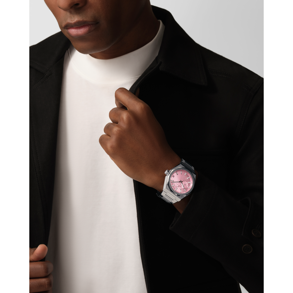 Montre DEFY Skyline dotée d’un boîtier octogonal en acier de 41 mm rehaussé d’une lunette à facettes, avec un cadran rose métallisé à motif soleillé revisitant l'emblématique étoile à quatre branches de ZENITH. Animée par le mouvement de manufacture automatique à haute fréquence El Primero 3620 avec le tout premier indicateur au 1/10e de seconde. Bracelet en acier interchangeable et bracelet en caoutchouc à motifs blanc. Une édition limitée à 100 exemplaires.
